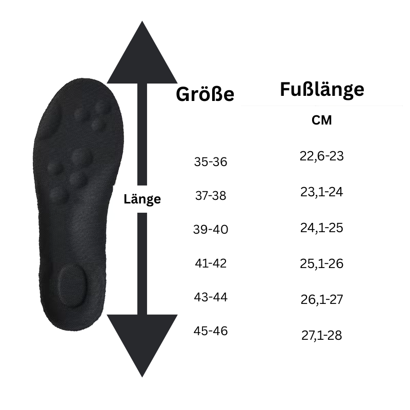 Das muss nicht sein. Mit diesen Einlegesohlen fühlt sich jeder Schritt an wie ein Spaziergang auf Wolken – weich, leicht, angenehm. Sie schenken dir ein unvergleichliches Gefühl von Leichtigkeit, das dich durch den Tag trägt – ob bei der Arbeit, beim Bummel oder Spaziergang. Genieße jeden Moment ohne Einschränkung und freue dich auf unbeschwerte Tage voller Wohlbefinden!